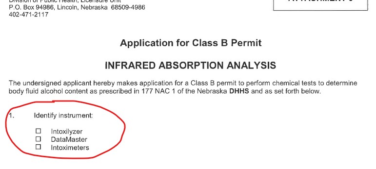 Upon passing this online exam, you will receive an email with your certificate of completion. When submitting Attachment 9 to NDHHS, you can indicate more than one device for which you want your Class B Permit (See picture below). You must attach all supporting documentation that you passed the online course(s) testing with your Attachment 9. Example: You take the online course for DataMaster offered through NLETC's training platform Moodle. You will receive your certificate of completion via email from us. You then take the online Intoxilyzer test and pass successfully. You will receive a certificate via email for that. You must submit both certificates of completion with Attachment 9 to NDHHS, and check both boxes (DataMaster & Intoxilizer) on Attachment 9.
